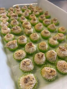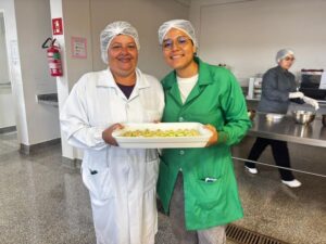 Figura 1. Alunas do Curso de Engenharia de Alimentos elaborando produtos no Laboratório de Processamento de Produtos de Origem Vegetal e Panificação, beijinho de bocaiuva com lasca de polpa de bocaiuva cristalizada e biscoito salgado de pequi.